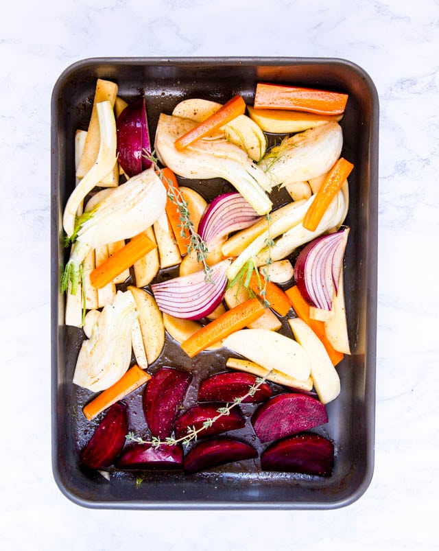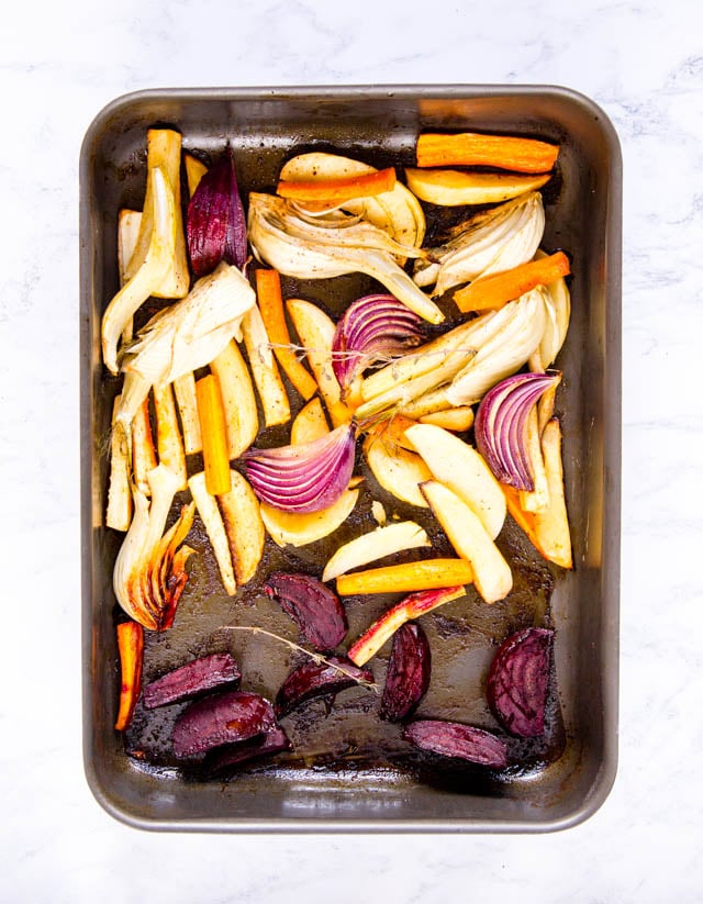 - Add the beetroot to one corner of the roasting pan, so as not to discolour all the other vegetables.