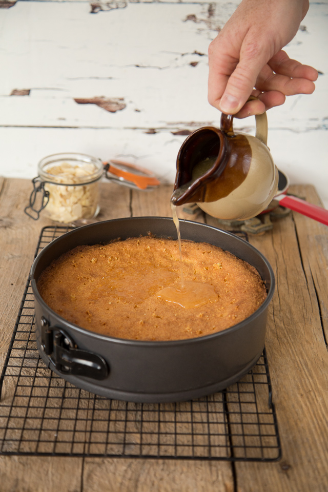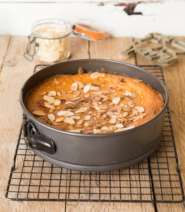 - Scatter over the toasted flaked almonds, while the cake is still sticky, and leave to cool in the tin.