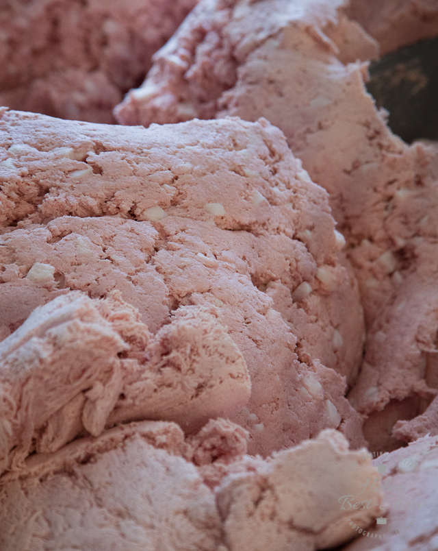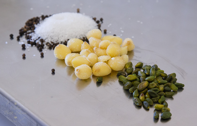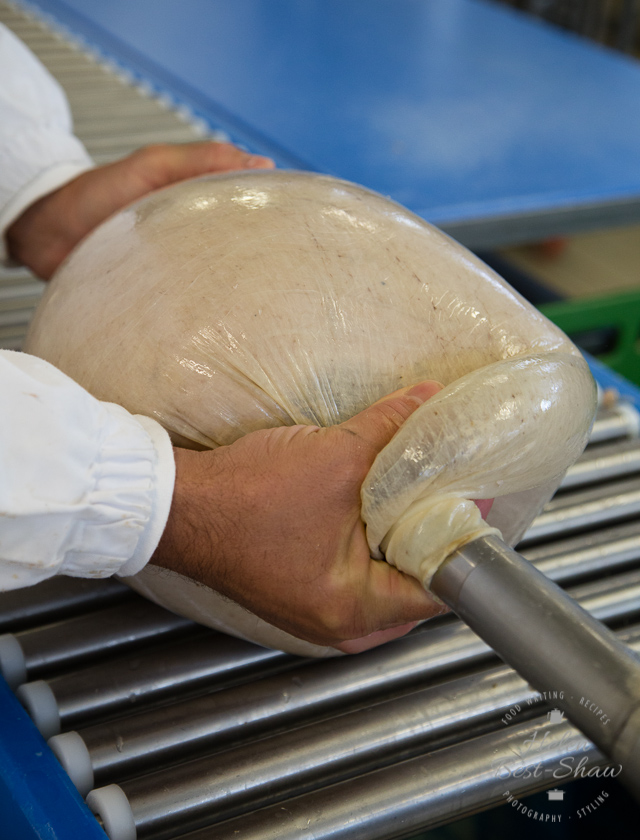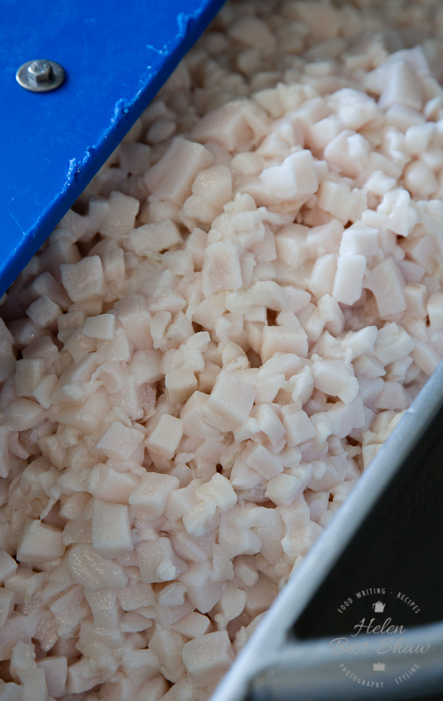 The frozen pork is chopped, then minced through a fine screen to form a smooth paste. Pepper, salt, garlic and the pistachios (when used) are added along with cubed fat which is taken from the throat of a hog; the hardest and best flavoured fat. Traditionally, mortadella was packed into cow’s bladders, but these days synthetic casings are used, and can weigh up to 150KG.