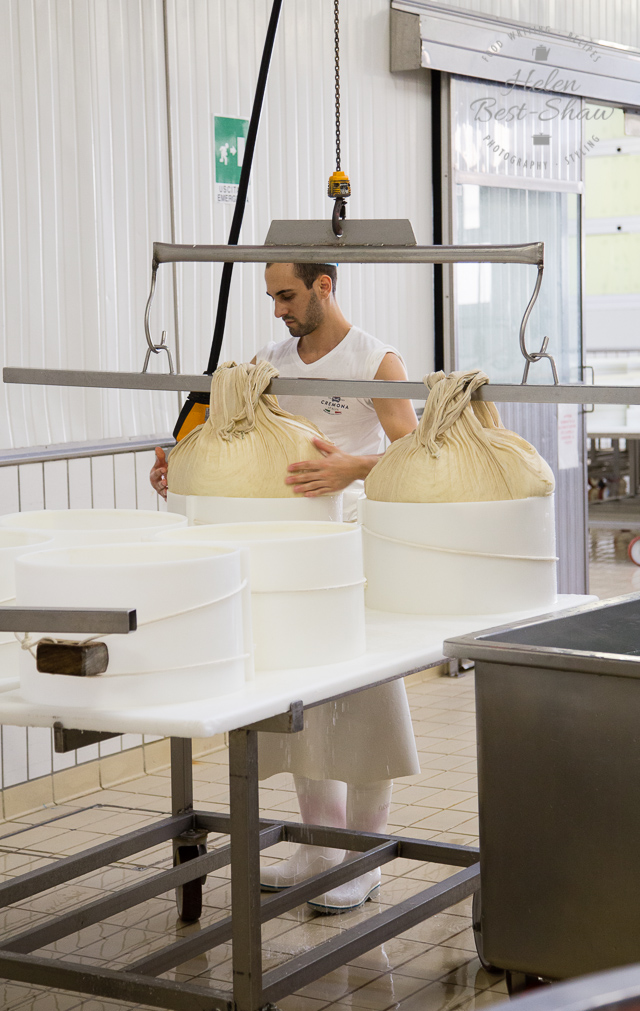 The fresh cheeses are lifted from the vats to the moulding area, where they are rinsed, and slowly lowered into the squat cylindrical moulds, called fascera, with the cheese cloths carefully folded on top of them. They are topped with a heavy disc.