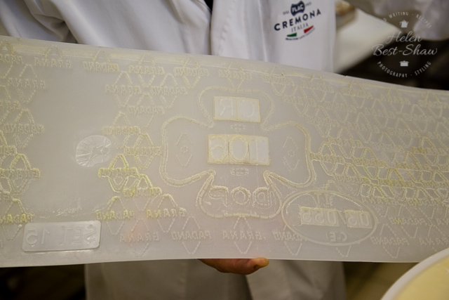 After 12 hours the all important mould marking stamp is placed between the wheel of cheese and the side of the fascera. This shows the serial number of the dairy, the province and the month and year of production. The diamond shaped lozanges contain the words Grana and Padano, and offer the guarantee to the quality, provenance and method of production. The fascera can be tightened by tapping on the block with a mallet. After about 24 hours the plastic fascera is replaced with a metal mould, with convex sides which gives the cheese its classic shape.