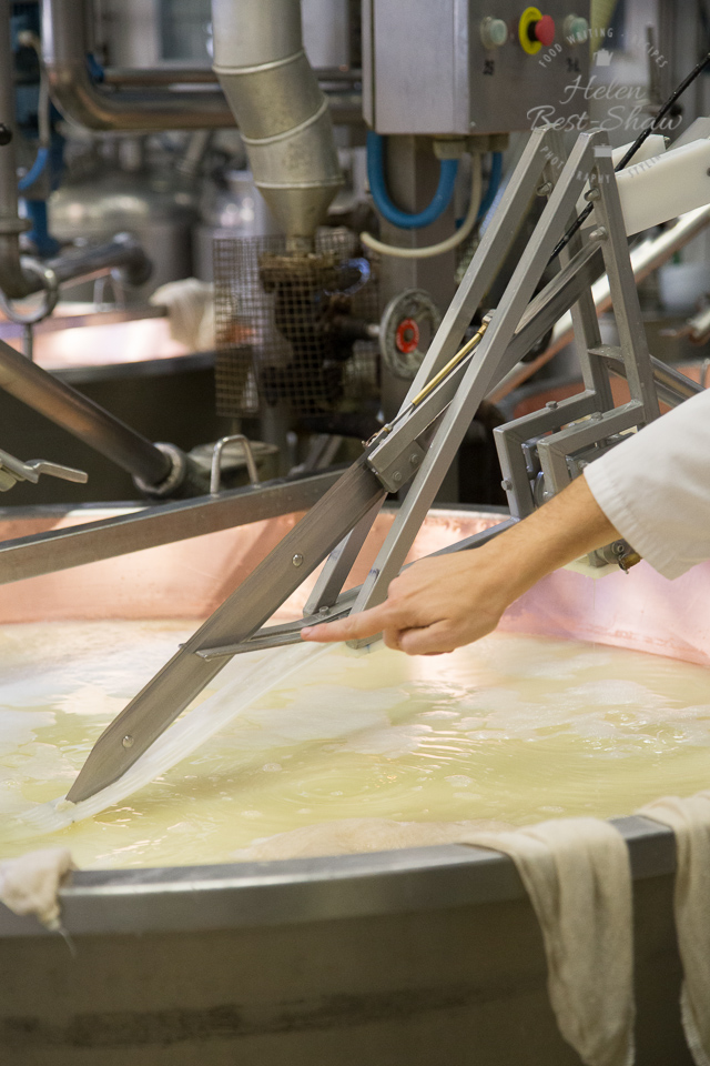 Like all cheese, the story starts with the milk. Grana Padano DOP is made from partially skimmed raw milk, from cows milk twice a day, and fed, of course, to the rules. The cheese is made in traditionally shaped copper vats, each of which will product two wheels of Grana Padano DOP. These days there are rows of vats in the dairy – the process is staggered so each vat is at a different stage of the process.