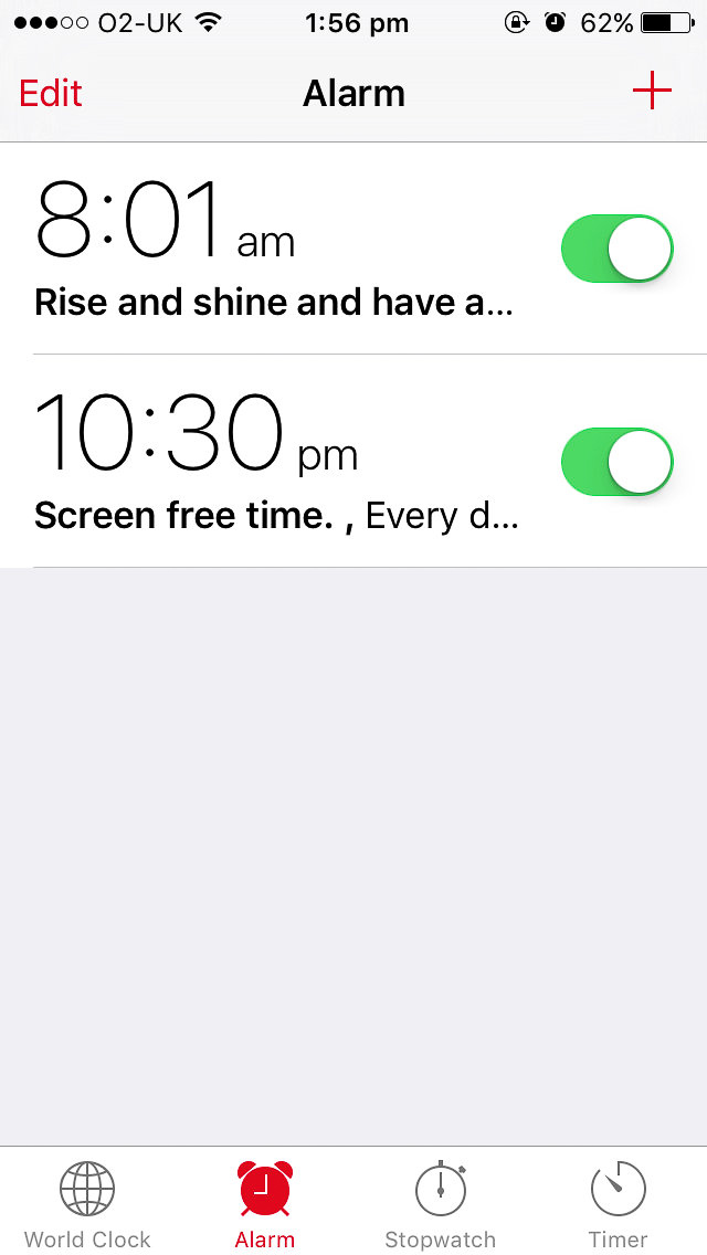 First off is a regular alarm time, mine is set for 8.01 – that important extra minute after 8am – with an affirming message to accompany it. To prepare for the best day possible, I need an excellent nights sleep, so I also have a night time reminder for screen free time. I am going to add some more alarms, all for the crucial 8.01 with other motivating affirmations. If I am awake before the alarm, and it is after 6.30 I generally get up and on with things.